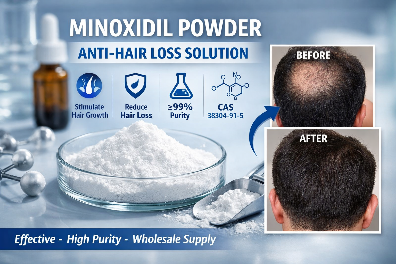 Nasz hurtowy proszek minoksydylu to wysokiej jakości składnik do leczenia wypadania włosów o czystości ≥99%, ściśle zgodny ze standardami jakości USP, EP i CP. Jako biały krystaliczny proszek (CAS: 38304-91-5), charakteryzuje się wyjątkową mocą i stabilnością, z okresem przydatności do spożycia do 3 lat, gdy jest przechowywany w chłodnych i suchych warunkach. Wyprodukowany w fabryce certyfikowanej GMP i ISO 22000, każda partia przechodzi rygorystyczne testy HPLC, zapewniając, że metale ciężkie (≤20ppm) i wskaźniki mikrobiologiczne są w pełni zgodne z międzynarodowymi wymaganiami farmaceutycznymi i kosmetycznymi.